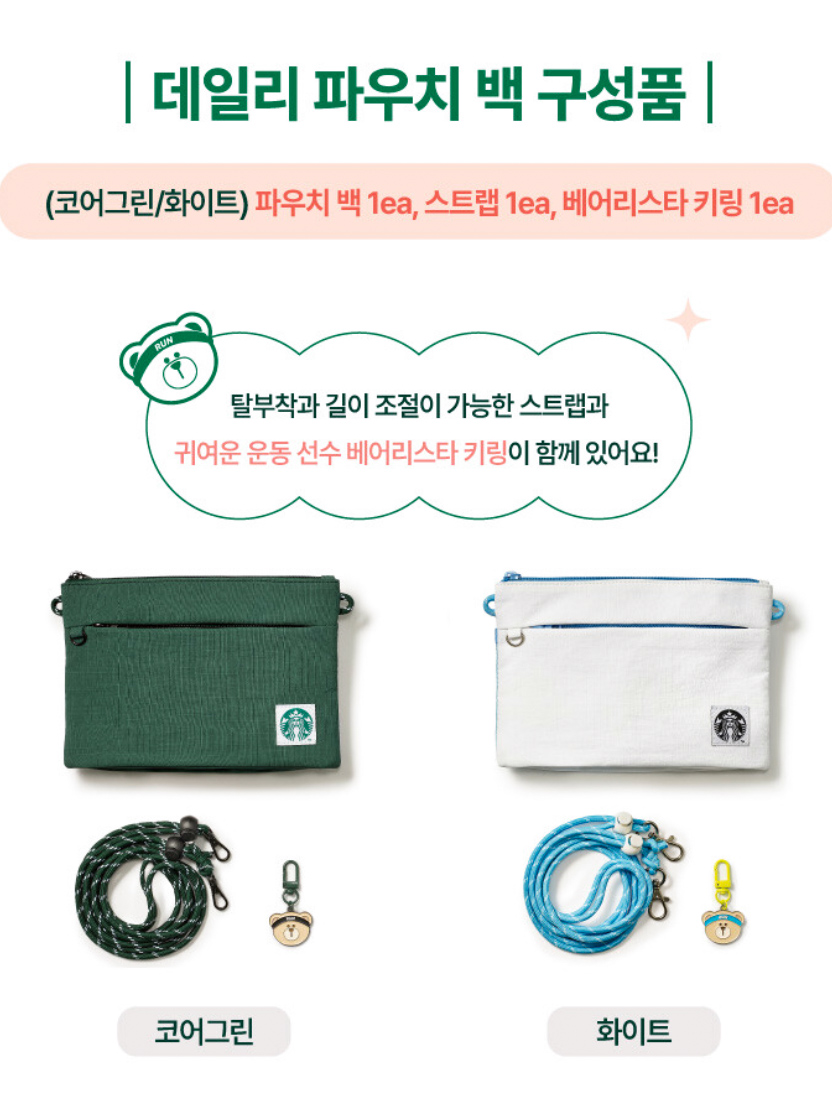 이번 스타벅스 파우치백 세트는 기본적으로 파우치백과 조절 가능한 스트랩, 그리고 귀여운 곰돌이 키링이 포함되어 있어요. 파우치백은 일상에서 자주 사용하는 아이템들을 수납하기에 적합하며, 스트랩을 이용해 편리하게 들고 다닐 수 있습니다.